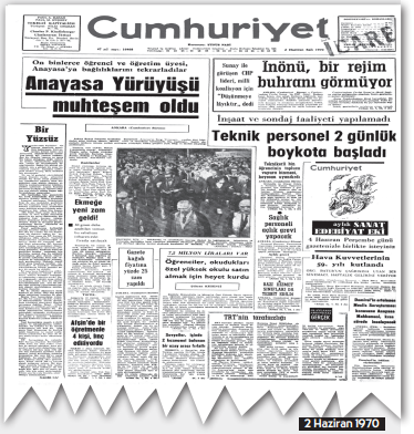 2 Haziran günü on binlerce öğrenci ve öğretim üyelerinin ortak anayasaya saygı yürüyüşleri var. Nadir Nadi’nin “Bir yüzsüz” başlıklı köşesindeki eleştiriler çarpıcı, dikkat çekici. 9 Haziran’da bir çatışma daha, bir öğrenci cinayetinin daha haberi yer alıyor. Üç fakültenin kapatma kararı da çıkıyor. İzmir’den kıyımdan sonra dövülüp yerlerde sürüklenen öğretmenlerin haberi verilmiş. Sunay’ın liderlerin Demirel’i değiştirin çağrılarına, hayır yanıtını verdiği Ankara kaynaklı haber olmuş. 25 Temmuz’da DPT’de görevli uzmanların bildirisi, “Hazine şeriatçı çevrelere akıtılıyor” saptamaları manşete taşınmış.