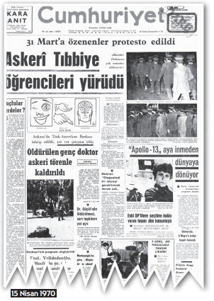 15 Nisan günlü gazeteyi de sizinle paylaşmak zorundayız. Askeri tıbbiye öğrencileri yürüyor. Ali Ulvi faili meçhul görünümlü faili bilinen cinayetlerin siyasal analizini yapıyor. Nadir Nadi köşesinden “Suçlular neredeler?” sorgulamasını yapıyor. Prof. Velidedeoğlu, görev yaptığı Gazi Meclis’in 50. yıl törenine katılmıyor.