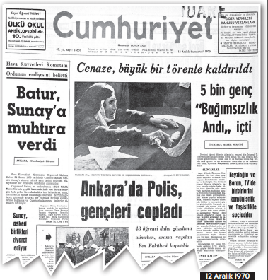 Paralel gelişmelerin ardı arkasının kesilmediği yıla 12.12.1970 tarihli sayfamızla nokta koymak anlamlı olabilir. İki gün önce Çapa’da işgal sürerken komandoların saldırısında yaralanan devrimci öğrenci Hüseyin Aslantaş komadan çıkamayarak ölünce, devrimci öğrencilerin tepki eylemlerinin patlamasıyla 8 fakülte kapatılıyor. Binlerce öğrencinin katıldığı cenaze töreninde Tulay Divitçoğlu arkadaşımızın çektiği annesinin tabutuna sarılması sahnesi, 12 Mart öncesi yaşatılanlara ilişkin simge olarak pek çok ödül birden alıyor..