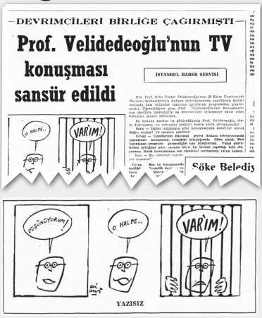 4 Ekim günlü gazetemizde, Velidedeoğlu’nun 27 Mayıs Anayasası’nın yazılımını yapan bilim insanı olarak da 29 Ekim Cumhuriyet’in kuruluşuna ilişkin konuşmasında, televizyon yayınında konulan sansürün haberi var. Velidedeoğlu Hoca, 27 Mayıs’ın Atatürk gibi toplayıcı bir liderin yoksunluğu nedeniyle tam başarıya ulaşamamasının yanında, en büyük eserinin 1961 Anayasası kazanımları olduğunun değerlendirmesini yapmış.