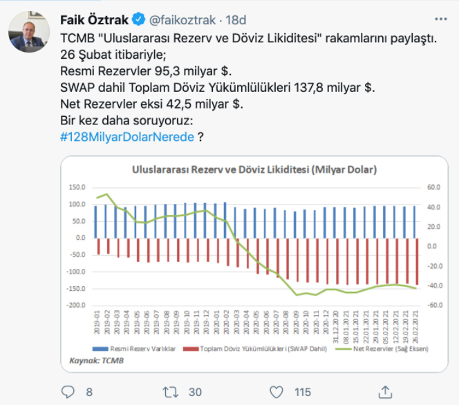 Öztrak, "TCMB 'Uluslararası Rezerv ve Döviz Likiditesi' rakamlarını paylaştı. "26 Şubat itibariyle; Resmi Rezervler 95,3 milyar dolar SWAP dahil Toplam Döviz Yükümlülükleri 137,8 milyar dolar. Net Rezervler eksi 42,5 milyar dolar. Bir kez daha soruyoruz: 128 milyar dolar nerede?" paylaşımını yaptı.