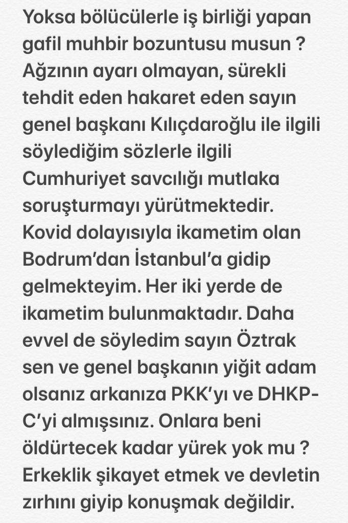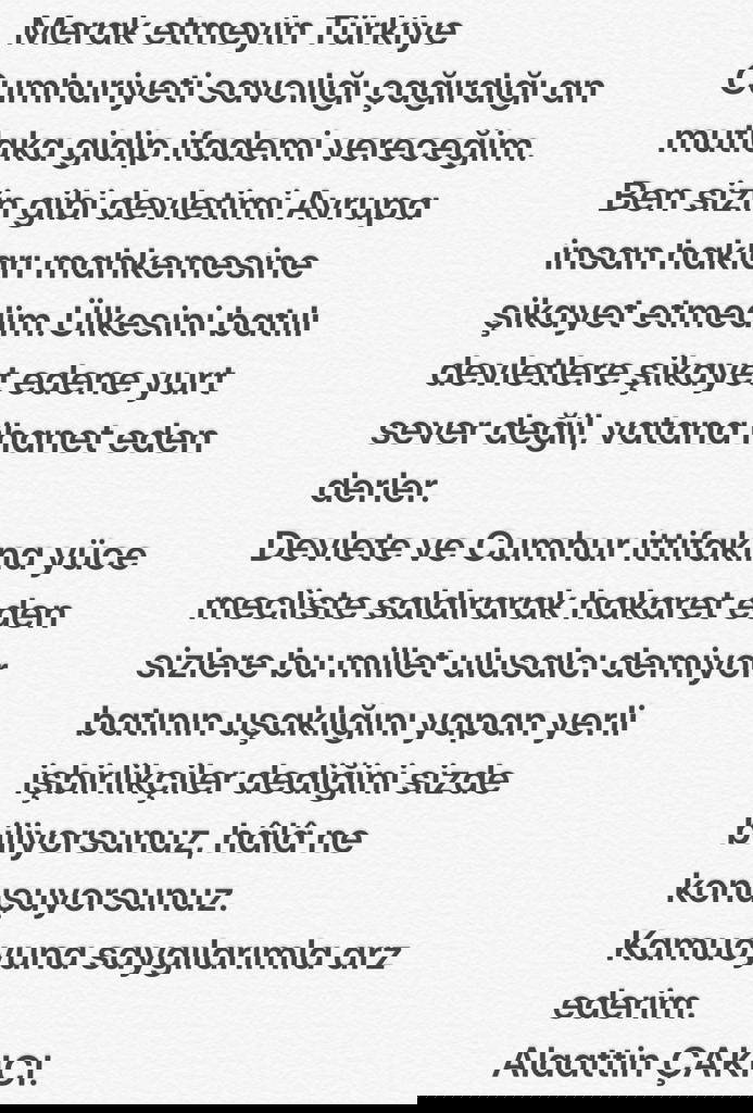 Savcılığın önceki paylaşımları ile ilgili "mutlaka soruşturma yürüteceğini" ifade eden Çakıcı, "Merak etmeyin Türkiye Cumhuriyeti savcılığı çağırdığı an mutlaka ifade vereceğim" dedi. Çakıcı, sosyal medyada paylaştığı üç açıklamada Kılıçdaroğlu'na yönelik hakaret içeren ifadeler kullanmıştı. Son olarak dün CHP Sözcüsü Öztrak'tan Çakıcı'nın açıklamaları için, "Bir mafya bozuntusu özel afla hapisten çıkarılıyor, genel başkanımızın üzerine salınıyor. Açık açık tehdit ediyor, sarayın bekçisi tehdit edene sahip çıkıyor. Savcılar biz şikayetçi olmadan resen harekete geçemediler. Bu soruşturma ne aşamada, bu mafya bozuntusunun ifadesi alındı mı? Saray artık yönetme kabiliyetini tamamen yitirmiştir" demişti.
