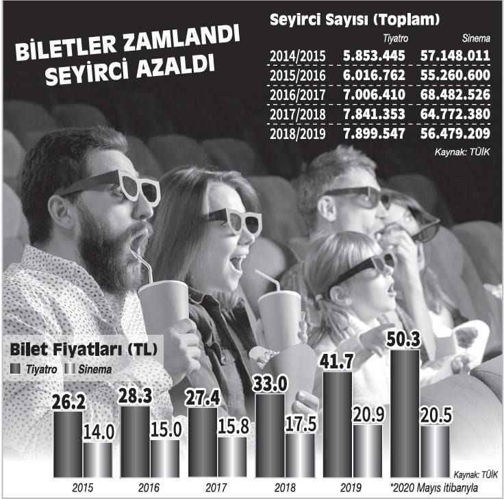 Türkiye İstatistik Kurumu’nun (TÜİK) dün 2019 yılına ilişkin açıkladığı Sinema ve Tiyatro İstatistikleri ile her ay güncellenen enflasyon verileri birleştirildiğinde, bilet fiyatları arttıkça seyirci sayılarındaki azalış dikkat çekiyor. Bu durum, çarşı pazardaki pahalılığın etkisiyle en temel ihtiyaçlarını almakta zorlanan yurttaşın, kültür harcamalarını kısması şeklinde yorumlanabilir.