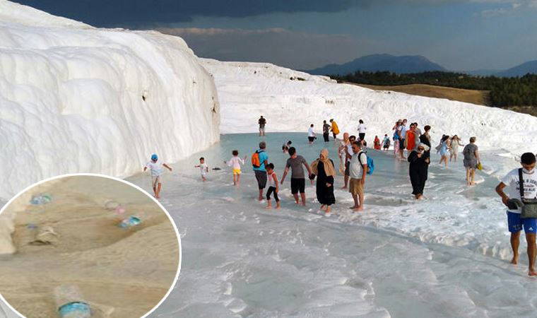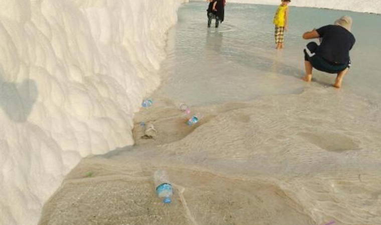 Travertenleri gezerken, çöpleri gören duyarlı ziyaretçiler ise duruma tepki gösterdi.