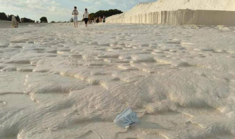 Pandemi dönemi nedeniyle özellikle yerli turistlerin geldiği Pamukkale'de bazı ziyaretçilerin, dünyada eşi benzeri olmayan ve yaklaşık 36 derece sıcak su akan beyaz travertenler üzerine maskelerini attıkları görüldü.