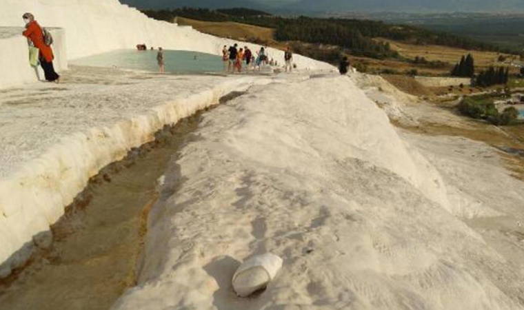 UNESCO Dünya Kültür Mirası Listesi'nde yar alan, beyaz travertenleriyle dünyaca ünlü Pamukkale'de utandıran görüntüler ortaya çıktı.