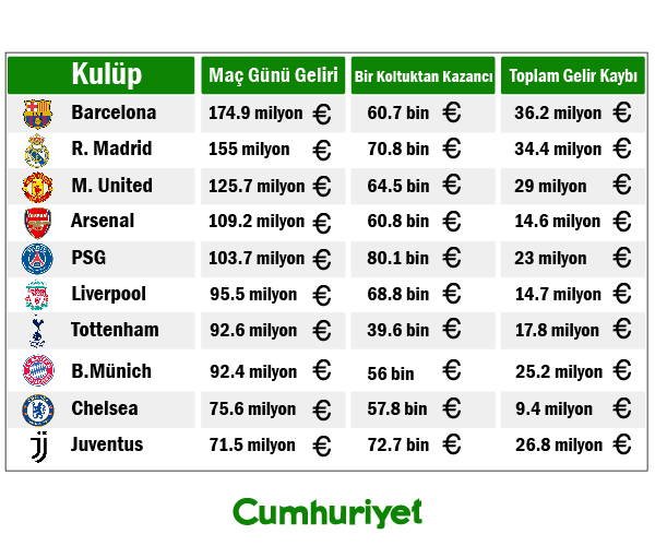 2018-2019 sezonunda 174.9 milyon Avroluk maç günü geliriyle zirvede yer alan İspanyol devi Barcelona, koronavirüs pandemisi nedeniyle 36.2 milyon Avroyla en çok gelir kaybı yaşayan kulüp olacak. Geçtiğimiz sezon 155 milyon Avro maç günü geliri elde eden Real Madrid'in kaybı ise 34.4 milyon Avro. Bu iki İspanyol ekibinin ardından en çok gelir kaybını ise 29 milyon Avroyla Manchester United yaşayacak.