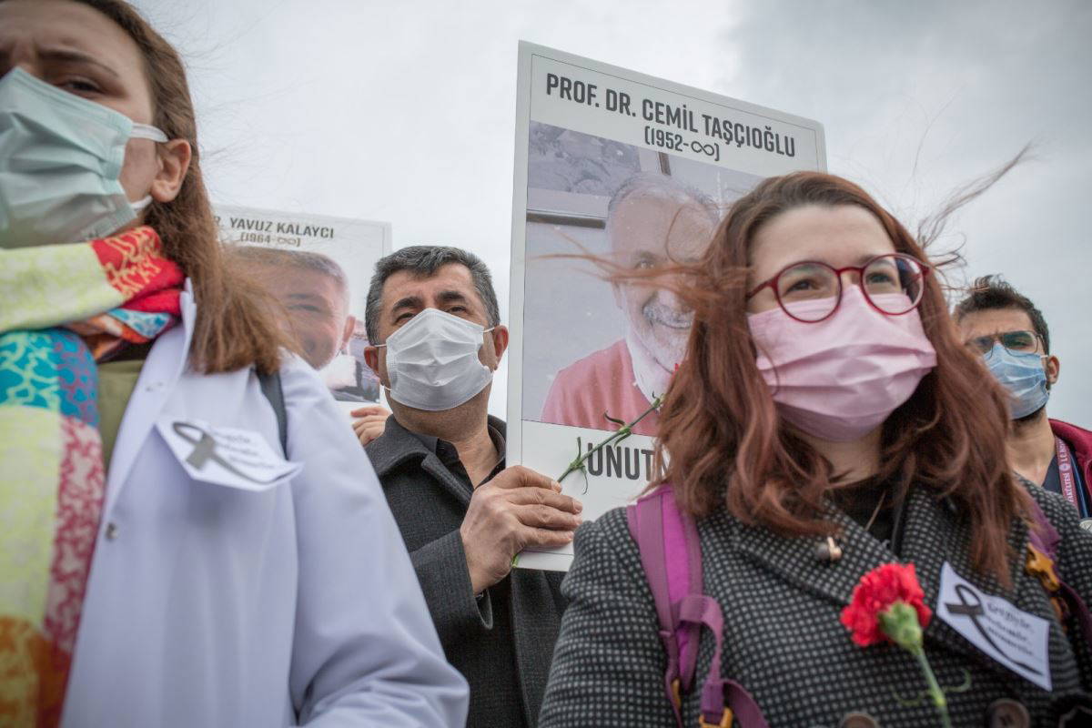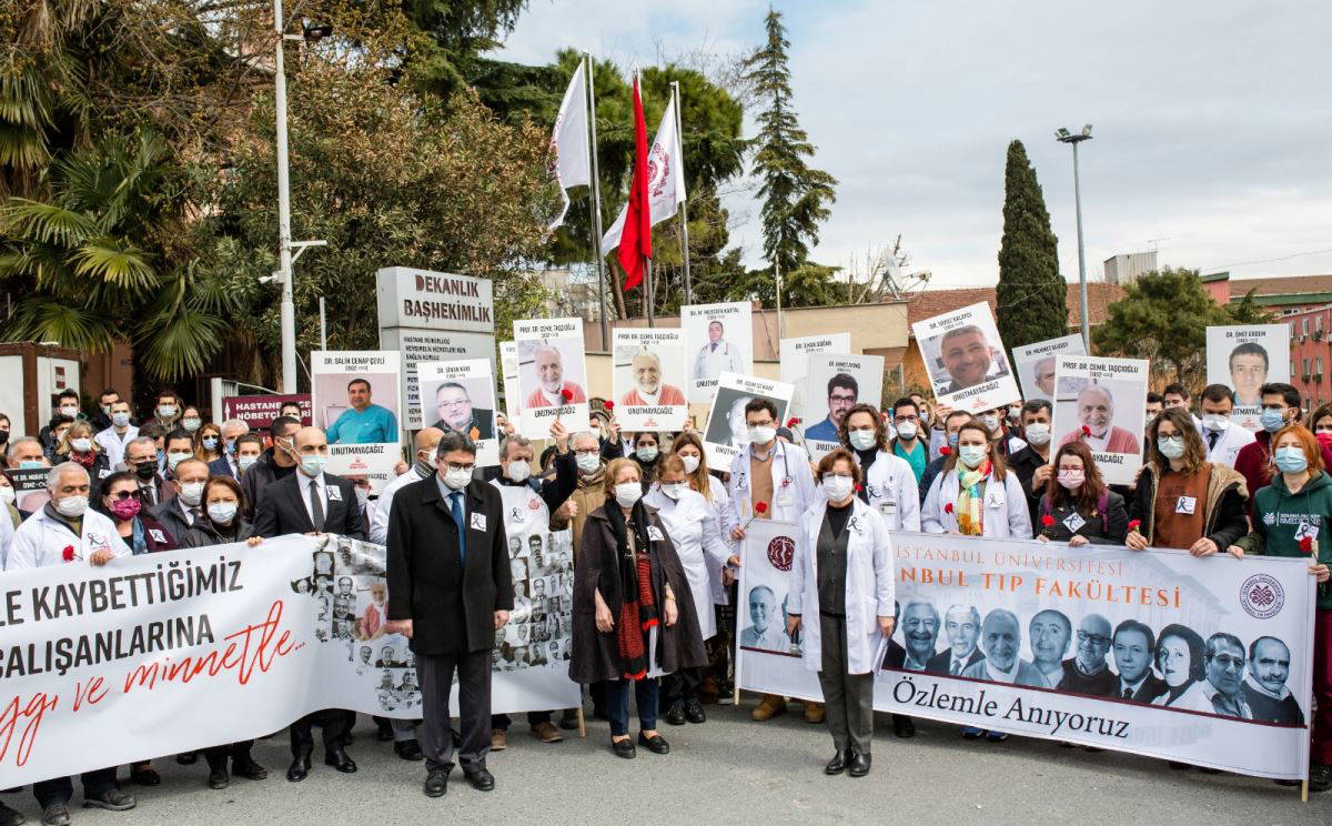 Saygı duruşuyla başlayan anmada “Özlemle anıyoruz”, “Covid19 sebebiyle kaybettiğimiz hekim ve sağlık çalışanlarını sevgi, saygı, minnetle” pankartları açıldı. Koronavirüsten hayatını kaybeden doktorların fotoğrafları taşındı.