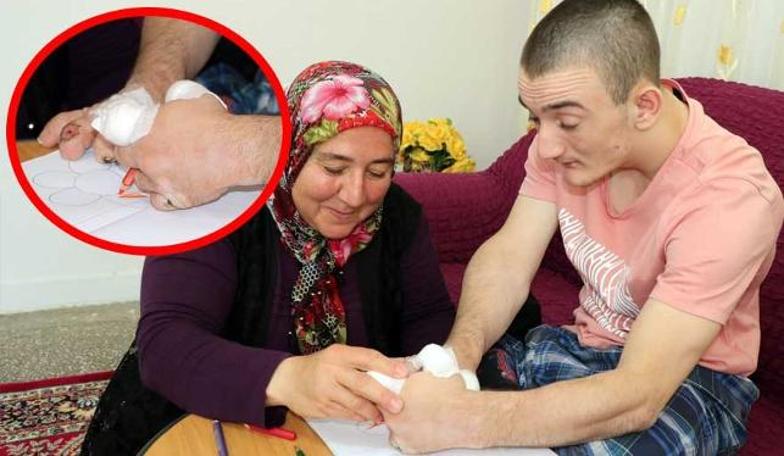 20 yaşındaki oğlu Muhammet Emre Dinç’in ağrıya karşı duyarsızlık sendromu hastalığı olduğunu anlatan anne Dudu Dinç, “Çocuğumun ‘ağrıya duyarsızlık sendromu’ hastalığı var. Doğuştan gelen genetiksel bir rahatsızlığı var. İki çocuğum var ikisi de şu anda aynı rahatsızlığı taşıyor. Yıllardır bu şekilde yaşıyoruz. 2007 yılında Muhammet sağ bacağını kaybetti. Ankara Hacettepe Hastanesi’nde oğlum tedavi görüyor. Tedavisi olmayan bir rahatsızlığa sahip. Dünyada çok nadir olan bir hastalığı var. Şu anda doktorlarımızın söylediğine göre Dünya’da ve Türkiye’de de bu yaşa gelip de bu hastalıkla olup yaşayan sadece benim oğlum var. 2013 yılında da sol bacağı riske girdi. 2013’ten bu tarafa sol bacağını da kullanamıyor. Daha önce protezi vardı. Protezle yürüyordu. Çoğu işini yine ben yapıyordum ama kendi de normal yürüyebiliyordu. Ama şu anda 2013’ten bu tarafa yürüyemiyor. O zamandan beri sırtımda indirip sırtımda çıkartıyorum. Elimden geldiği kadar çocuklarımın sosyal hayattan koparmamaya çalışıyorum. Okuluna götürüyorum, özel eğitime gidiyor. Kaynaştırma öğrencisi olarak 8. sınıfa kadar okudu. Ben kendimi, hayatımı çocuklarıma adadım. Onlar yatarsa yatıyorum her şeyim çocuklarım benim. 7 gün 24 saat beraberiz. Çok seviyorum, sevgim sayesinde ayakta duruyorum. Rabbim bu rahatsızlığı, acıları hiçbir aileye yaşatmasın. Çok acılar çektik, çok ameliyatlar oldu, çok kırıklarımız oldu. Oğlum 50’yi geçkin ameliyat oldu. Şu anda çok ciddi açık yaraları var. Sürekli günde 4-5 kez belki daha fazla pansuman yapıyorum. Günüm pansumanla geçiyor” dedi.