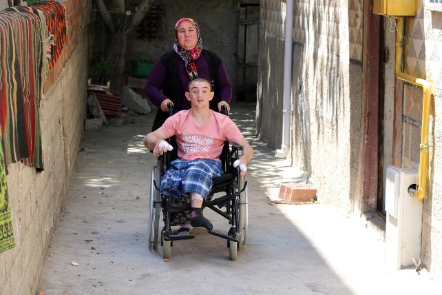 İlçede rehabilitasyon merkezinde eğitim alan Muhammet Emre Dinç’in en büyük destekçisi ise 44 yaşındaki annesi Dudu Dinç. Eşi mevsimlik biçerdöver şoförü olduğu için yılın birçok döneminde çocuklarıyla ilgilenen ve kendini çocuklarına adayan fedakar anne, Muhammet Emre Dinç’in günde 4-5 kez pansumanını yapıyor, ders çalıştırıyor, yemek yediriyor ve çocuğunun hayattan kopmaması için dışarıda onunla birlikte zaman geçiriyor. Eşinin babasından kalma evinde yaşayan ve binalarında asansör olmadığı için engelli çocuğunu 6 yıldır günde 2-3 sefer sırtında taşımak zorunda kalan ve artık yorulan anne Dudu Dinç, apartmanda çocuğunu rahat bir şekilde taşıyabilmek için asansör hayali kuruyor. Hiçbir maddi beklentisi olmayan anne Dudu Dinç’in tek isteği binalarına oğlu için asansör yaptırılması.