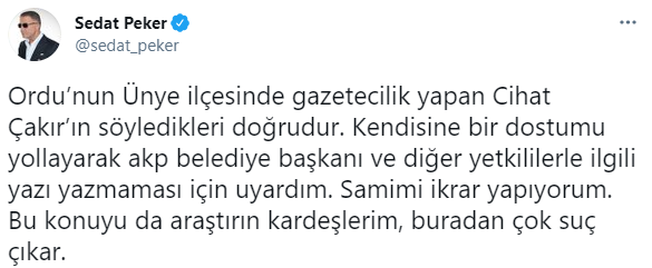Twitter hesabından açıklamada bulunan Sedat Peker, "bir dostu" vasıtasıyla Ünye'de gazetecilik yapan Cihan Çakır'ı AKP'li belediye başkanıyla ilgili yazı yazmaması için uyardığını belirtti.
