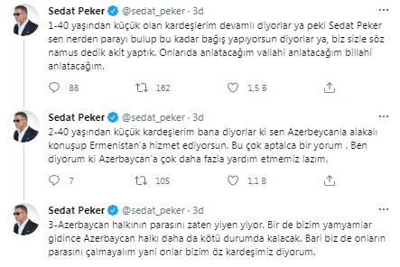 Peker, Twitter hesabından şu ifadeleri kullandı: