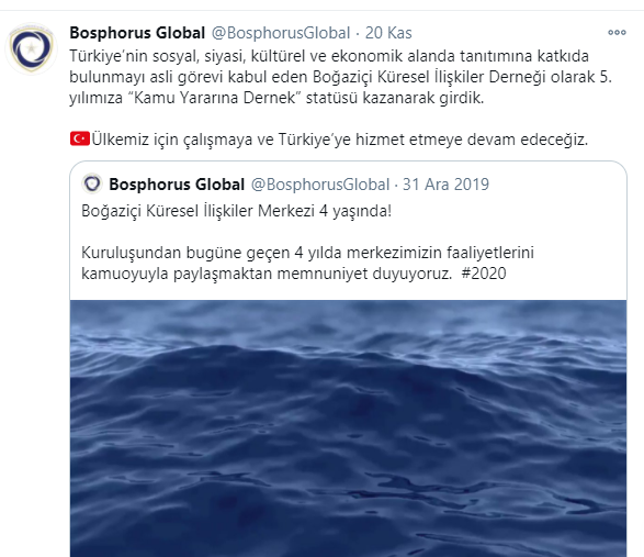 Bosphorus Global'in Twitter hesabından yapılan açıklamada, “Türkiye’nin sosyal, siyasi, kültürel ve ekonomik alanda tanıtımına katkıda bulunmayı asli görevi kabul eden Boğaziçi Küresel İlişkiler Derneği olarak 5. yılımıza 'Kamu Yararına Dernek' statüsü kazanarak girdik. Ülkemiz için çalışmaya ve Türkiye’ye hizmet etmeye devam edeceğiz” denildi.