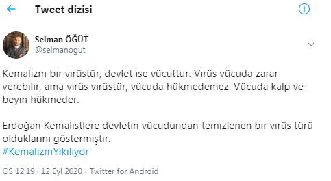 Kemalizmi hedef alan yandaş isim, sosyal medya hesabından "Kemalizm bir virüstür, devlet ise vücuttur. Virüs vücuda zarar verebilir, ama virüs virüstür, vücuda hükmedemez. Vücuda kalp ve beyin hükmeder" diye yazdı. Provokatif sözlerine Cumhurbaşkanı Tayyip Erdoğan'ı da dayanak gösteren yandaş isim, "Erdoğan Kemalistlere devletin vücudundan temizlenen bir virüs türü olduklarını göstermiştir." ifadelerini kullandı.