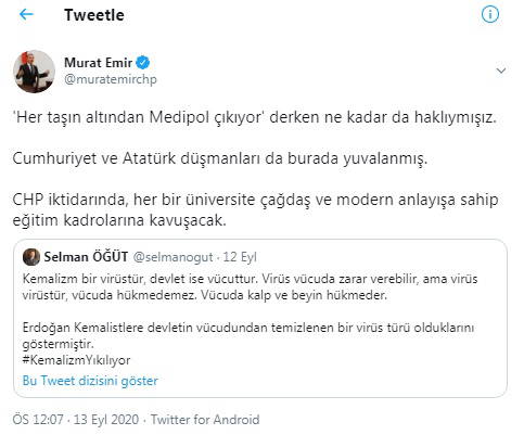Selman Öğüt'ün provokatif paylaşımına CHP'den sert tepki geldi. CHP Ankara Milletvekili ve Parti Meclisi Üyesi Murat Emir, Selman Öğüt'ün görev yaptığı üniversite ile Sağlık Bakanı Fahrettin Koca'nın ilişkisine dikkat çekerek "'Her taşın altından Medipol çıkıyor' derken ne kadar da haklıymışız.Cumhuriyet ve Atatürk düşmanları da burada yuvalanmış." dedi.