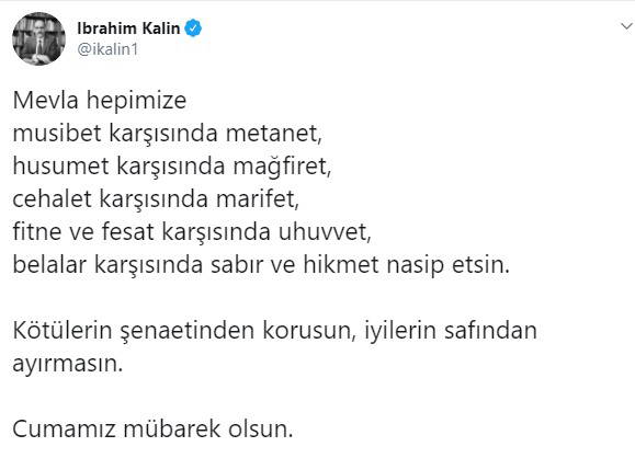 Kalın mesajında, “Mevla hepimize musibet karşısında metanet, husumet karşısında mağfiret, cehalet karşısında marifet, fitne ve fesat karşısında uhuvvet, belalar karşısında sabır ve hikmet nasip etsin. Kötülerin şenaetinden korusun, iyilerin safından ayırmasın. Cumamız mübarek olsun” dedi.
