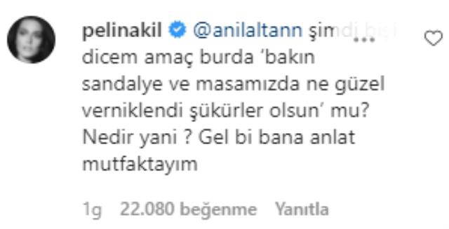 Akil eşinin fotoğrafının altına, "Şimdi bir şey diyeceğim: Burada amaç, 'Bakın sandalye ve masamız da güzel verniklendi şükürler olsun mu?' Nedir yani? Gel bana bir anlat mutfaktayım" yorumunu yaptı.