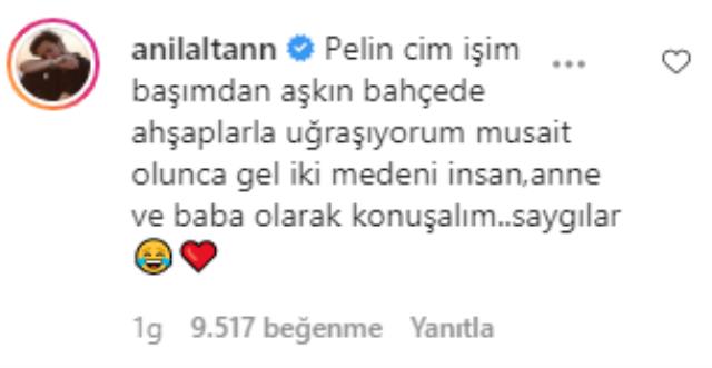Anıl Altan ise eşine, "Pelin'ciğim işim başımdan aşkın... Bahçede ahşaplarla uğraşıyorum. Müsait olunca gel iki medeni insan anne ve baba olarak konuşalım. Saygılar" ifadeleriyle yanıt verdi.