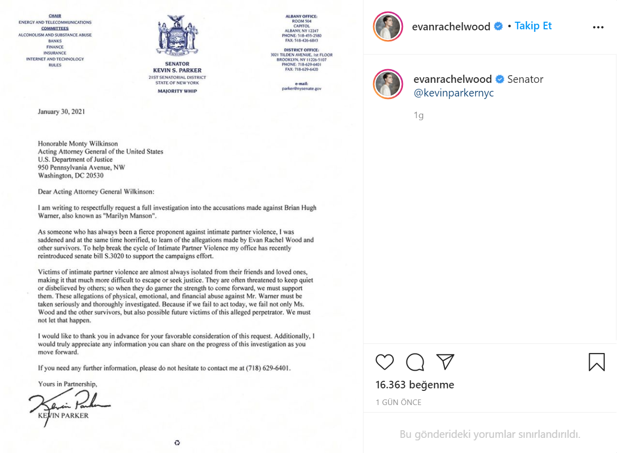 1 Şubat'ta eski nişanlısı aktris Evan Rachel Wood da Instagram hesabında, Manson tarafından yıllarca korkunç bir şekilde taciz edildiğini iddia ettiği bir paylaşım yapmıştı.
