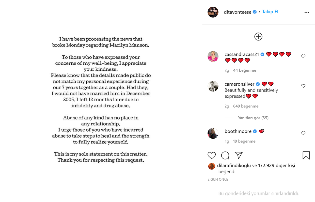 Manson'ın eski eşi Dita von Teese de dün konuya ilişkin olarak bir Instagram gönderisinde açıklama yaptmıştı. 2005 yılında Manson ile evlendiğini fakat Manson'ı sadakatsizlik ve uyuşturucu bağımlılığı nedeniyle terk ettiğini söyleyen von Teese, "Lütfen son günlerde kamuoyuna Manson hakkında açıklanan detayların Manson'la olan yedi yıllık kişisel deneyimlerime uymadığını bilin. Öyle olsaydı eğer onunla Aralık 2005'te evlenmezdim" dedi.