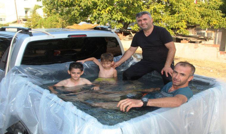 Tepe Mahallesi'nde ikamet eden Bozkurt, hem kendisi hem de çocuklarını serinletmek için pikap aracının kasasını naylon ile kaplayarak içine su doldurdu.