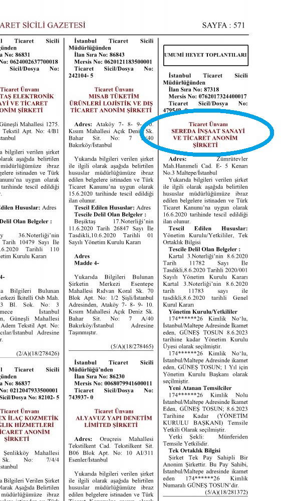 İhaleyi alan şirketlerden Sereda İnşaat’ın Yönetim Kurulu Başkanlığında Güneş Tosun bulunuyor. Güneş Tosun bu görevi 8 Haziran 2020'de eşi Yaşar Tosun’dan devraldı. Yaşar Tosun'un kardeşi Necati Tosun da Tuzla’da faaliyet gösteren bir müteahhit ve aynı zamanda AKP’de aktif siyaset yapıyor. Bir süre önce AKP Tuzla İlçe Yönetim Kurulu’nda bulunan Necati Tosun, Tuzla Belediye Meclis üyeliğine aday olmak için ilçe yönetimindeki görevinden istifa etmişti. Necati ve Yaşar Tosun kardeşler önceki yıllarda bir başka firmada da otaklık yapmıştı.