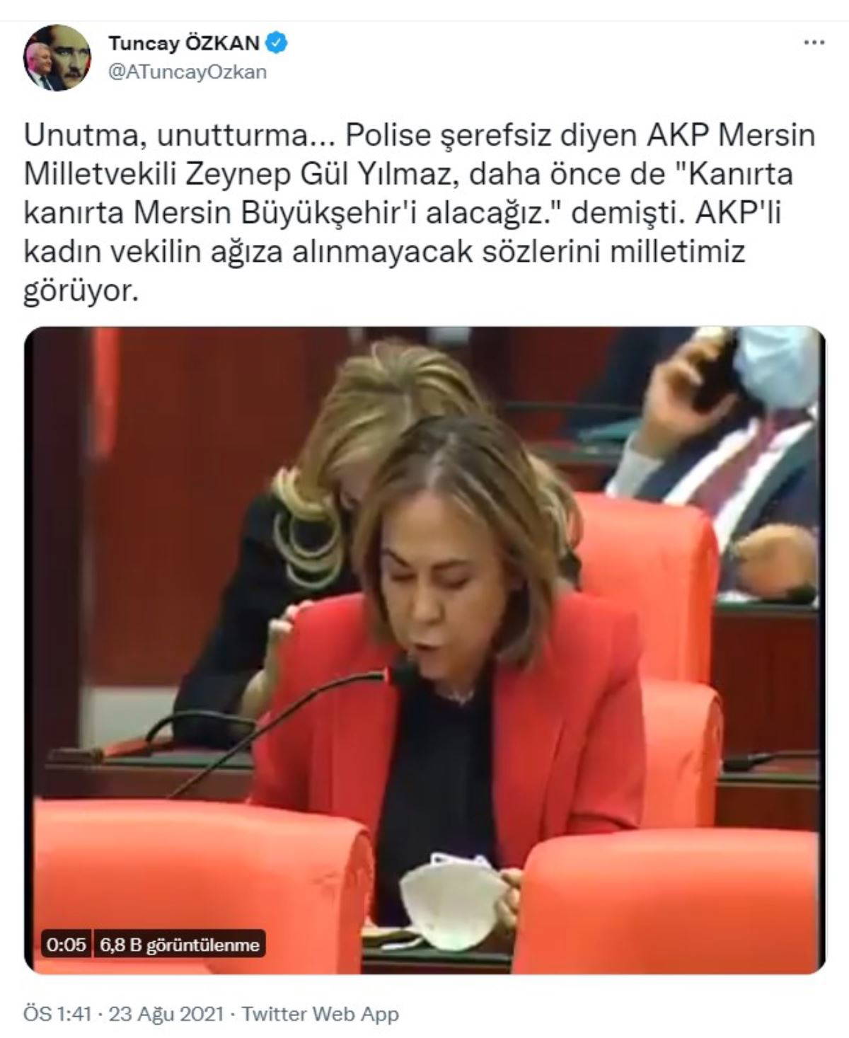 Özkan, ''Unutma, unutturma... Polise şerefsiz diyen AKP Mersin Milletvekili Zeynep Gül Yılmaz, daha önce de "Kanırta kanırta Mersin Büyükşehir'i alacağız" demişti. AKP'li kadın vekilin ağıza alınmayacak sözlerini milletimiz görüyor'' dedi.