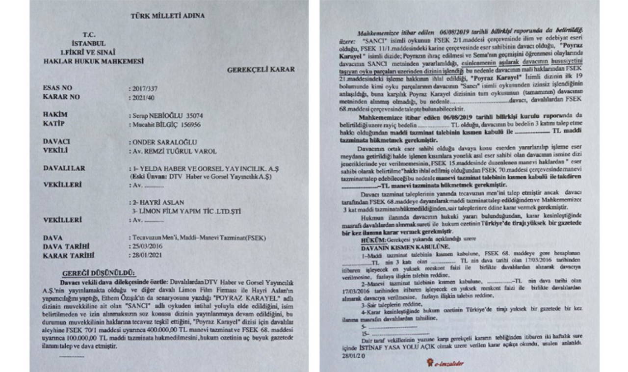 İlker Kaleli, Burçin Terzioğlu ve Musa Uzunlar’ın başrollerini paylaştığı dizinin yapımcılarına telif davası açan yazar Önder Saraloğlu, İstanbul 1.Fikri ve Sınai Haklar Hukuk Mahkemesinde haklı bulundu.