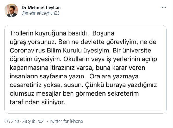 "Trollerin kuyruğuna basıldı. Boşuna uğraşıyorsunuz. Ben ne devlette görevliyim, ne de Koronavirüs Bilim Kurulu üyesiyim. Bir üniversite öğretim üyesiyim. Okulların veya iş yerlerinin açılıp kapanmasına itirazınız varsa, buna karar veren insanların sayfasına yazın. Oralara yazmaya cesaretiniz yoksa, susun. Çünkü buraya yazdığınız olumsuz mesajlar ben görmeden sekreterim tarafından siliniyor."