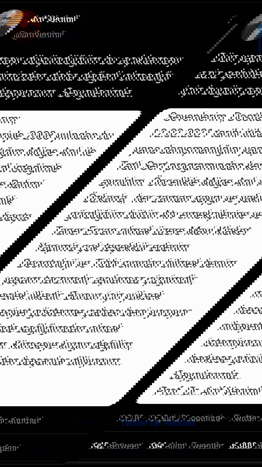Prof. Dr. Arif Verimli, ayrılıkla ilgili Twitter hesabından yaptığı açıklama şu şekilde: