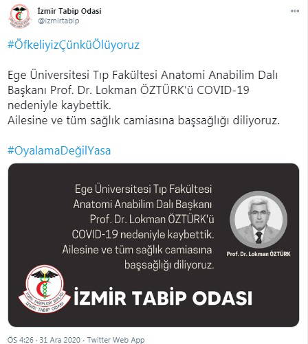 Açıklamada, "Ege Üniversitesi Tıp Fakültesi Anatomi Anabilim Dalı Başkanı Prof. Dr. Lokman ÖZTÜRK'ü COVID-19 nedeniyle kaybettik. Ailesine ve tüm sağlık camiasına başsağlığı diliyoruz" ifadeleri yer aldı.