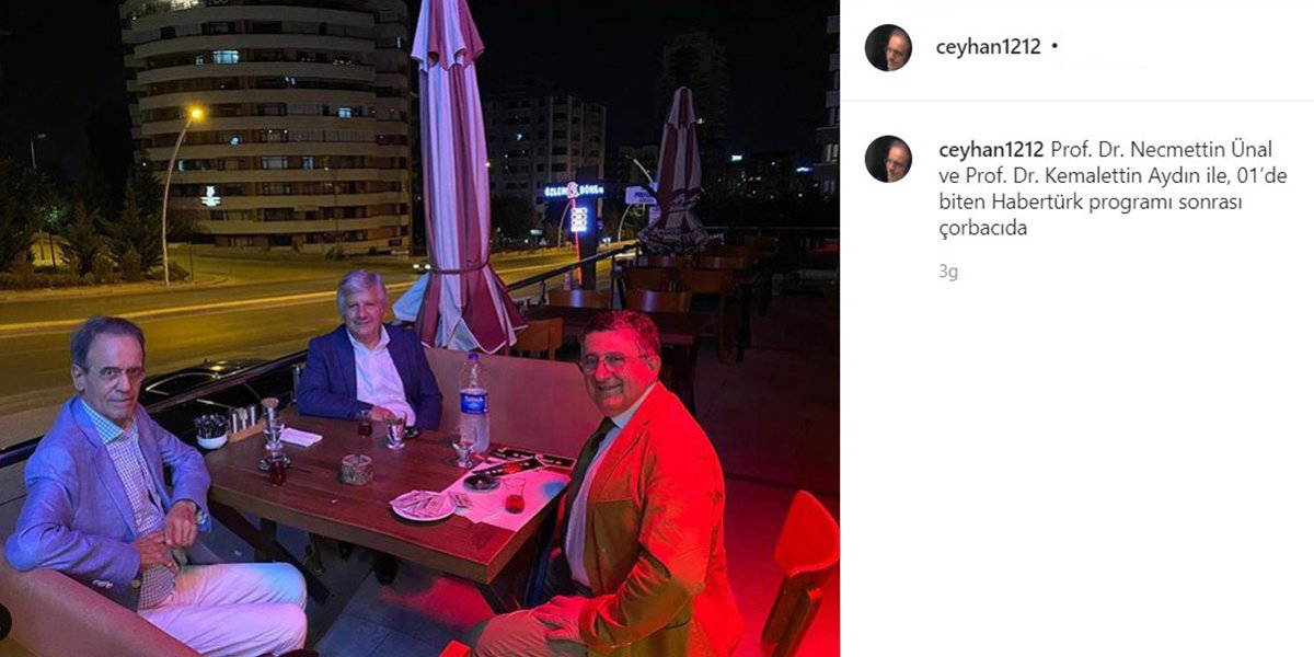 Prof. Dr. Mehmet Ceyhan, “Prof. Dr. Necmettin Ünal ve Prof. Dr. Kemalettin Aydın ile, 01’de biten Habertürk programı sonrası çorbacıda” notunu düşerek bir fotoğraf paylaştı. Prof. Dr. Ceyhan'ın bu paylaşımı sosyal medyada yoğun eleştiri aldı.