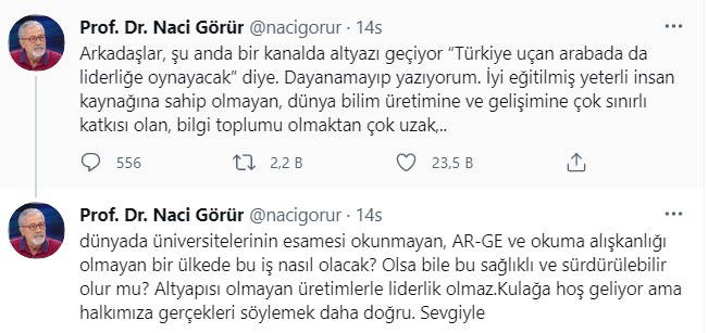 “Arkadaşlar, şu anda bir kanalda altyazı geçiyor 'Türkiye uçan arabada da liderliğe oynayacak' diye. Dayanamayıp yazıyorum. İyi eğitilmiş yeterli insan kaynağına sahip olmayan, dünya bilim üretimine ve gelişimine çok sınırlı katkısı olan, bilgi toplumu olmaktan çok uzak.