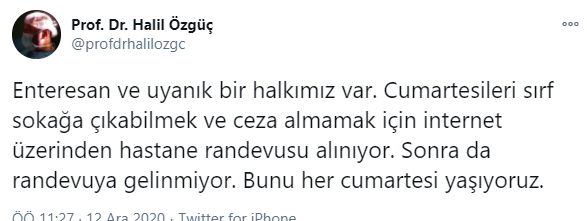 Hafta sonu iki gün boyunca vatandaşların evde kalması için yasak uygulanırken, Prof Dr. Halil Özgüç kimi yurttaşların yasağı aşmak için hastanden randevu aldığını söyledi. Twitter hesabından açıklama yapan Özgüç, “Enteresan ve uyanık bir halkımız var. Cumartesileri sırf sokağa çıkabilmek ve ceza almamak için internet üzerinden hastane randevusu alınıyor. Sonra da randevuya gelinmiyor. Bunu her cumartesi yaşıyoruz” dedi.
