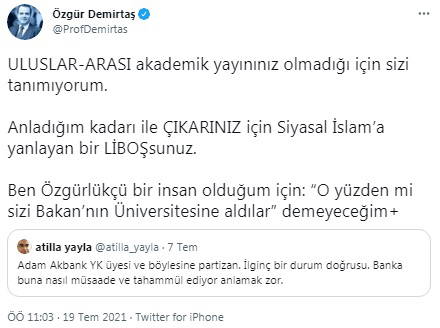 Liberal Düşünce Topluluğu kurucusu Atilla Yayla, sosyal medya hesabından Prof. Dr. Özgür Demirtaş’ı hedef alan bir paylaşımda bulundu.