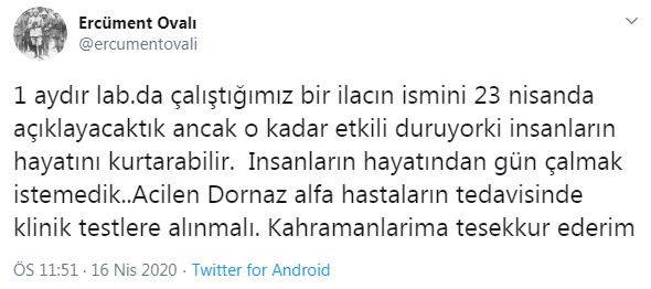 Konuya ilişkin Twitter hesabından açıklama yapan Hematoloji Uzmanı Prof. Dr. Ovalı, “1 aydır laboratuvarda çalıştığımız bir ilacın ismini 23 Nisan’da açıklayacaktık ancak o kadar etkili duruyor ki insanların hayatını kurtarabilir. İnsanların hayatından gün çalmak istemedik. Acilen Dornaz alfa hastaların tedavisinde klinik testlere alınmalı. Kahramanlarıma teşekkür ederim” diye yazdı.