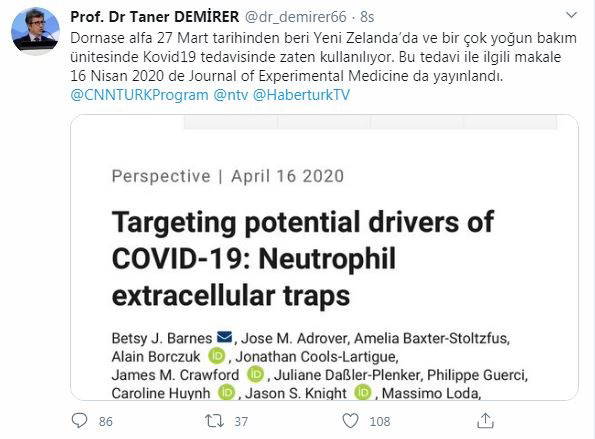 Demirer mesajında, “Dornase alfa 27 Mart tarihinden beri Yeni Zelanda’da ve bir çok yoğun bakım ünitesinde Kovid19 tedavisinde zaten kullanılıyor. Bu tedavi ile ilgili makale 16 Nisan 2020 de Journal of Experimental Medicine da yayınlandı” dedi.