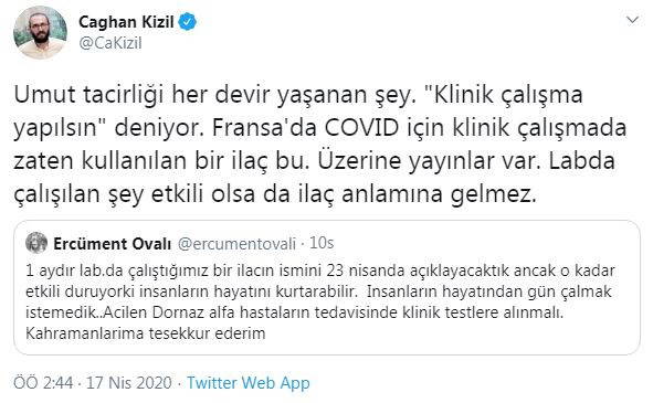 Sinir bilim ve genetik uzmanı Doç. Dr. Çağhan Kızıl da, Ovalı’nın açıklaması hakkında, “Umut tacirliği her devir yaşanan şey. "Klinik çalışma yapılsın" deniyor. Fransa'da COVID için klinik çalışmada zaten kullanılan bir ilaç bu. Üzerine yayınlar var. Labda çalışılan şey etkili olsa da ilaç anlamına gelmez” ifadelerini kullandı.