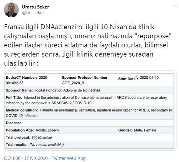 Bilkent Üniversitesi Ulusal Nanoteknoloji Araştırma Merkezinde (UNAM) proje yürüten Doç. Dr. Urartu Şeker de, “Fransa ilgili DNAaz enzimi ilgili 10 Nisan'da klinik çalışmaları başlatmıştı, umarız hali hazırda "repurpose" edilen ilaçlar süreci atlatma da faydalı olurlar, bilimsel süreçlerden sonra” ifadelerini kullandı.
