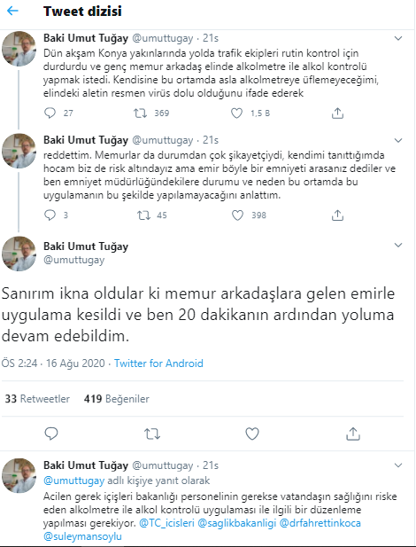 “Dün akşam Konya yakınlarında yolda trafik ekipleri rutin kontrol için durdurdu ve genç memur arkadaş elinde alkolmetre ile alkol kontrolü yapmak istedi. Kendisine bu ortamda asla alkolmetreye üflemeyeceğimi, elindeki aletin resmen virüs dolu olduğunu ifade ederek. Sanırım ikna oldular ki memur arkadaşlara gelen emirle uygulama kesildi ve ben 20 dakikanın ardından yoluma devam edebildim. Acilen gerek İçişleri Bakanlığı personelinin gerekse vatandaşın sağlığını riske eden alkolmetre ile alkol kontrolü uygulaması ile ilgili bir düzenleme yapılması gerekiyor.”