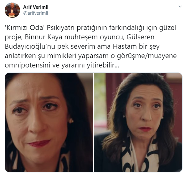 Psikiyatrist Prof. Dr. Arif Verimli'de dizi hakkındaki düşüncelerini sosyal medya hesabından paylaştı.Verimli dizi hakkında "'Kırmızı Oda' Psikiyatri pratiğinin farkındalığı için güzel proje, Binnur Kaya muhteşem oyuncu, Gülseren Budayıcıoğlu'nu pek severim ama Hastam bir şey anlatırken şu mimikleri yaparsam o görüşme/muayene omnipotensini ve yararını yitirebilir" dedi.