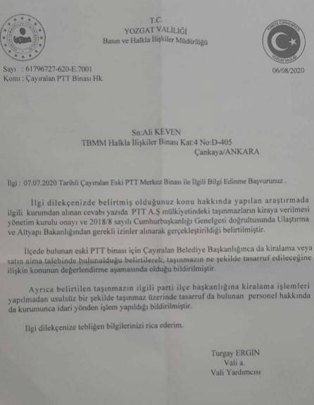 Yozgat'ın Çayıralan ilçesinde kullanılmayan PTT binasını 4 ay önce AKP İlçe Başkanlığı olarak kullanılmaya başlandı. Bunun üzerine CHP'li Keven, valiliğe bina için bir tahsis veya kiralama ihalesinin yapılıp yapılmadığını sordu. Valilik, taşınmazla ilgili parti başkanlığına kiralama işlemi yapılmadığı yanıtını verdi.