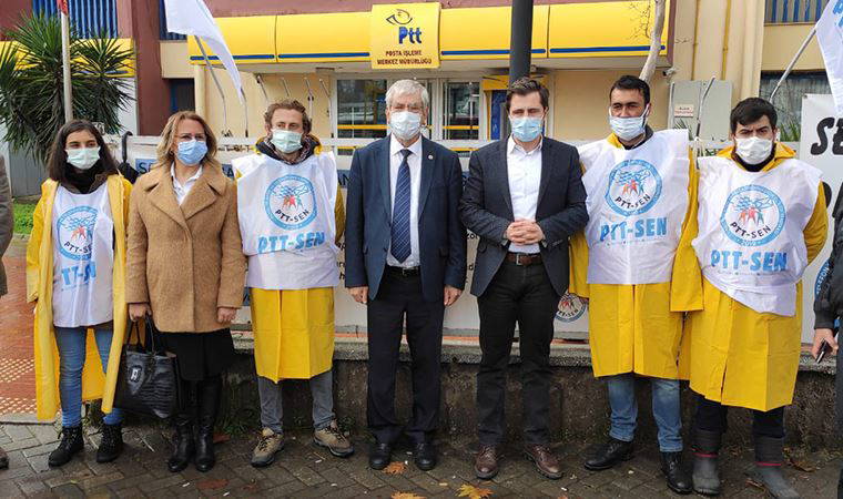 İzmir'de Posta Transfer Taşımacılık ve Kargo İşçileri Sendikası (PTT Kargo Sen) ile Posta Telefon ve Telekomünikasyon İşçileri Sendikası'na (PTT Sen) üye oldukları için işten çıkarılan 16 işçinin eylemine CHP'den destek geldi. CHP İzmir İl Başkanı Deniz Yücel, CHP İzmir Milletvekili Kani Beko ve CHP Bayraklı İlçe Başkanı Pınar Susmuş, Bayraklı'da PTT Merkez Müdürlüğü önünde eylemde olan işçilere destek için buraya giderek basın açıklaması yaptı.