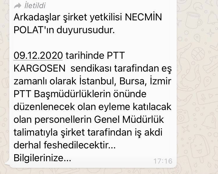 09.12.2020 tarihinde PTT KARGOSEN sendikası taraından eş zamanlı olarak İstanbul, Bursa, İzmir PTT Başmüdürlüklerin önünde düzenlenecek olan eyleme katılacak olan personellerin Genel Müdürlük talimatıyla şirket tarafından iş akdi derhal feshedilecektir...