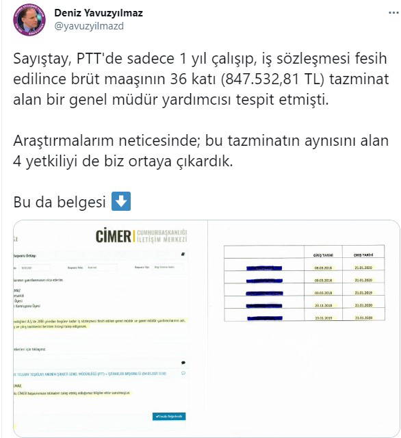 "Sayıştay, PTT'de sadece 1 yıl çalışıp, iş sözleşmesi fesih edilince brüt maaşının 36 katı (847.532,81 TL) tazminat alan bir genel müdür yardımcısı tespit etmişti. Araştırmalarım neticesinde; bu tazminatın aynısını alan 4 yetkiliyi de biz ortaya çıkardık."