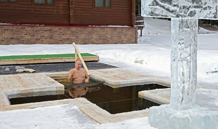 Rusya Devlet Başkanı Putin mavi renkli mayosuyla -20 derecedeki buzlu suya girerek, vaftiz oldu.