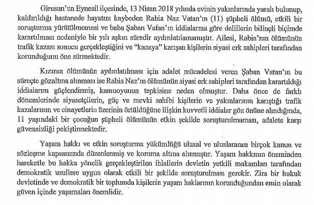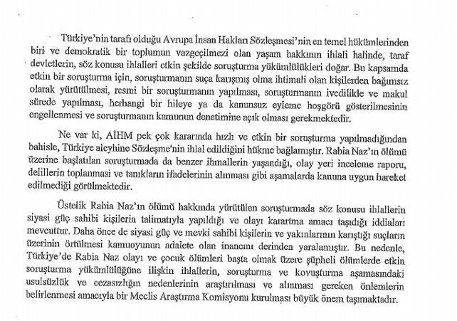 Ankara Milletvekili Filiz Kerestecioğlu imzasıyla verilen araştırma önergesinde kızının ölümünün aydınlatılması için adalet mücadelesi veren baba Şaban Vatan’ın bu süreçte gözaltına alınmasının Rabia Naz’ın ölümünün siyasi erk sahipleri tarafından karartıldığı iddialarını güçlendirdiği belirtilmişti.
