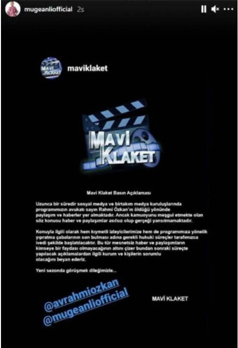 Programın yapımcı kuruluşu Mavi Klaket'in yapmış olduğu açıklamayı kendi sosyal medya hesabından paylaşan Müge Anlı, konuya açıklık getirdi.