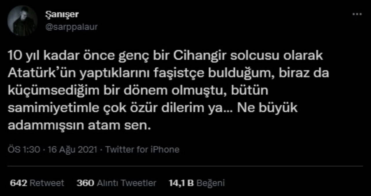 Müzisyen, rapçi, söz yazarı ve 'Şanışer' olarak bilinen Sarp Palaur, Atatürk paylaşımıyla sosyal medyada gündeme oturdu.