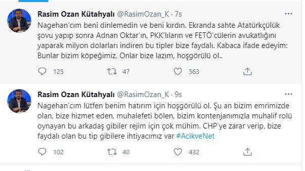 Program sırasında ültimatomlarını sürdüren Kütahyalı, ''Nagehan’cım beni dinlemedin ve beni kırdın. Ekranda sahte Atatürkçülük şovu yapıp sonra Adnan Oktar’ın, PKK’lıların ve FETÖ’cülerin avukatlığını yaparak milyon dolarları indiren bu tipler bize faydalı. Kabaca ifade edeyim: Bunlar bizim köpeğimiz. Onlar bize lazım, hoşgörülü ol" ifadelerini kullandı.